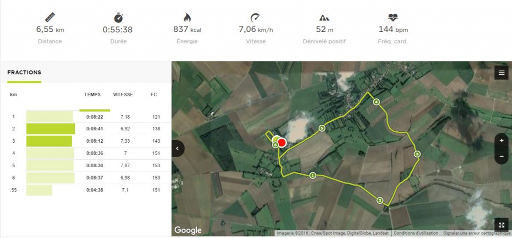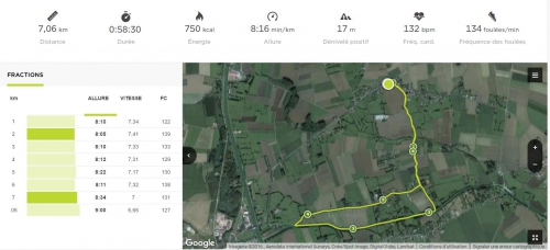 Résultat : une meilleure moyenne que samedi avec 7.12 km/h de moyenne et un rythme cardiaque moins soutenu . Que du bon !