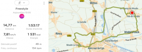 Nous décidons alors de partir sur Aire Sur La Lys en passant par le Widdebrouck puis retour à Boëseghem par La Ballastière et Garlinghem pour éviter au maximum la départementale , celle qui passe devant la maison , limitée à 30 mais que seul 1% des conducteurs respecte ... Un circuit de plus de 14 km sous régime de croisière correct .
